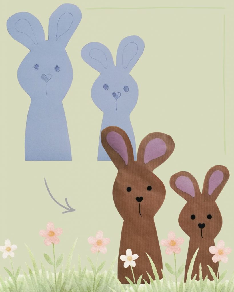 - Zeichnen Sie die Hasenform auf ein A4-Papier vor und übertragen Sie diese auf Backpapier. Schneiden Sie pro Hasen zwei identische Formen aus.