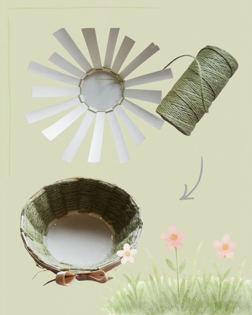 - Flechten Sie das Körbchen in der gewünschten Höhe mit Wolle, Schnur oder Bast.