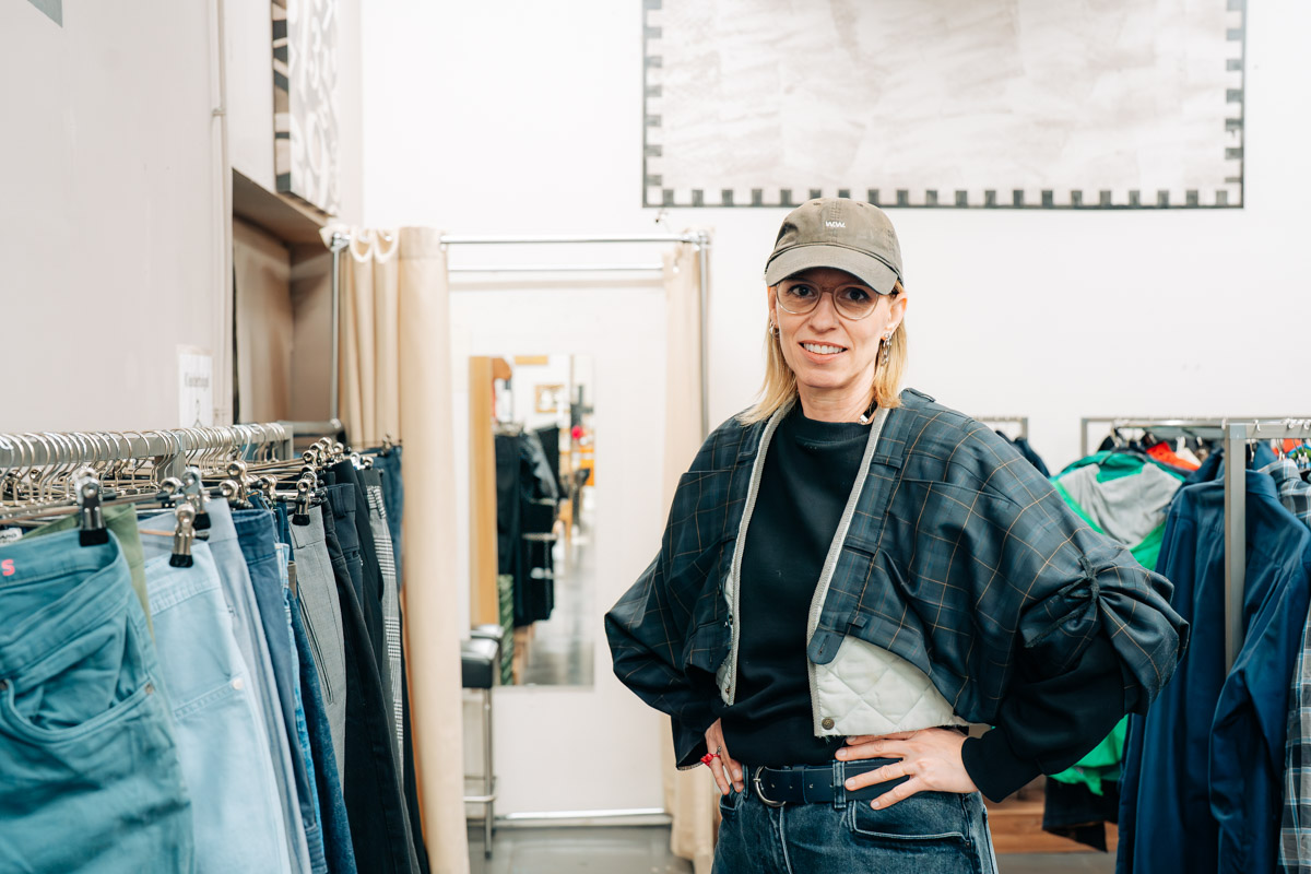 Britta travaille avec des vêtements d’occasion, des petits gadgets, des bijoux, de la vaisselle et apprécie particulièrement les pièces issues du rayon homme. Over-size, robustes, transformables. Elle a déjà cousu de nouveaux vêtements à partir de pantalons et de vestes de costume, combiné des tissus de jeans et utilisé des matériaux de manière à leur donner un nouveau sens. C’est le cas, par exemple, d’un pantalon de costume classique qu’elle a entièrement remanié pour en faire une veste – un vêtement qui, grâce à cette transformation, a acquis une nouvelle silhouette et une nouvelle histoire.